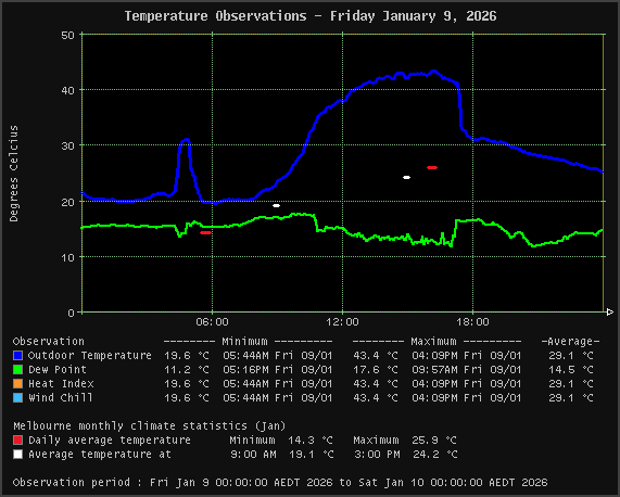 | Heat Index | 19.6 °C | 43.4